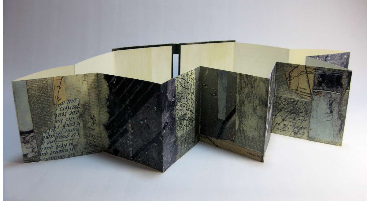 Hoy voy a poner uno de los dos libros de artista que encuadernamos cuando hicimos el curso de encuadernación en acordeón con Ana Ruiz Larrea. La pena es que no recuerdo el nombre de la artista que nos facilitó los libros, creo que era belga o francesa. Son obras digitales, así que toda la clase encuadernamos los mismos libros y, como siempre en estos casos, resulto muy interesante ver las diferentes formas de expresión de la gente. Me pasaré por la escuela cuando empiece el curso a ver si consigo las fotos de este monográfico.